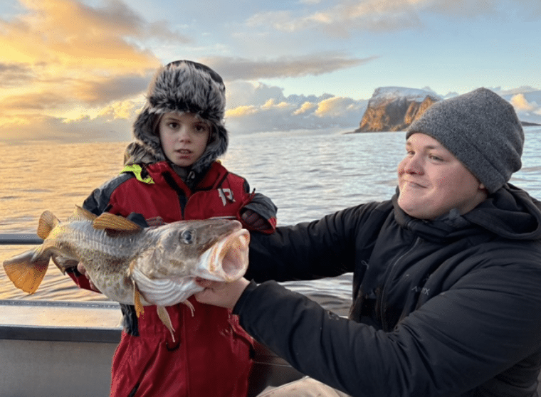 Now he was running out of bait. He fetched the fishing rod, and we were amazed at how quickly the fish bit. Our girls watched in fascination. Now he asked them if they wanted to try their luck. With Jakob’s help, our middle daughter Flurina pulled a cod out of the water. Jakob wanted to know what we wanted to do with it. When we answered, he got his fish knife and filleted the fish for us right on the boat, so we would have freshly caught cod for dinner. Jakob let us enjoy the sunset. In the last light of the day, we tried again to attract the sea eagles before he drove us back.