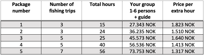 Your group will have your own guide for all the trips and these packages assume consecutive days. Then you have the option to adjust the starting time depending on the weather and the opportunity to move hours between days. By booking 3 or 5 trips, the boat is always reserved for an extra day (before/after) and with 7 trips, the boat is reserved for 2 extra days (before/after). This way, the boat is available on these extra days, which provides flexibility in case of bad weather conditions or requests for extra trips. Therefore, we also recommend a minimum length of stay, so that we can take the trips on the days with the best weather. For these packages, we have also adjusted the price compared to individual trips, as we know that several of you want to use your own equipment. In any case, all fishing equipment and clothing are included, and only quality equipment is used, mainly from Shimano.