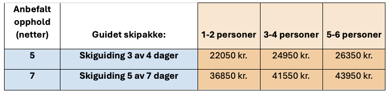 I tillegg må gjestene selv sørge for eget toppturutstyr, skredutstyr og klær for lange dager i vinterfjellet. Gjester kan leie utstyr de mangler på www.tromsooutdoor.com. Ta kontakt med www.tromsoskiguides.com hvis du har spørsmål til nødvendig utstyr.