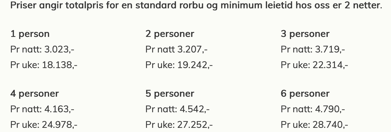 Priser angir totalpris for en rorbu og minimum leietid hos oss er 2 netter.