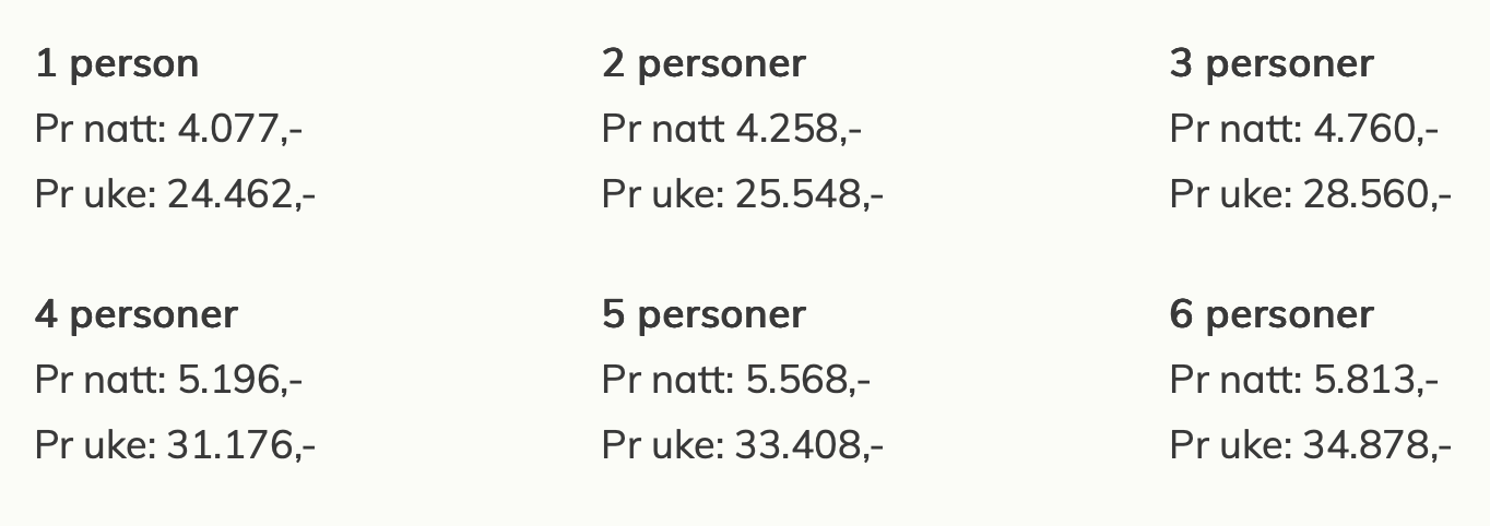 Inkludert oppredde senger og sluttvask. Pris i NOK, inkludert mva. Barn 0 – 12 år: Gratis (Viktig at du oppgir i egen kommentar antall barn, slik at riktig antall senger blir oppredd).